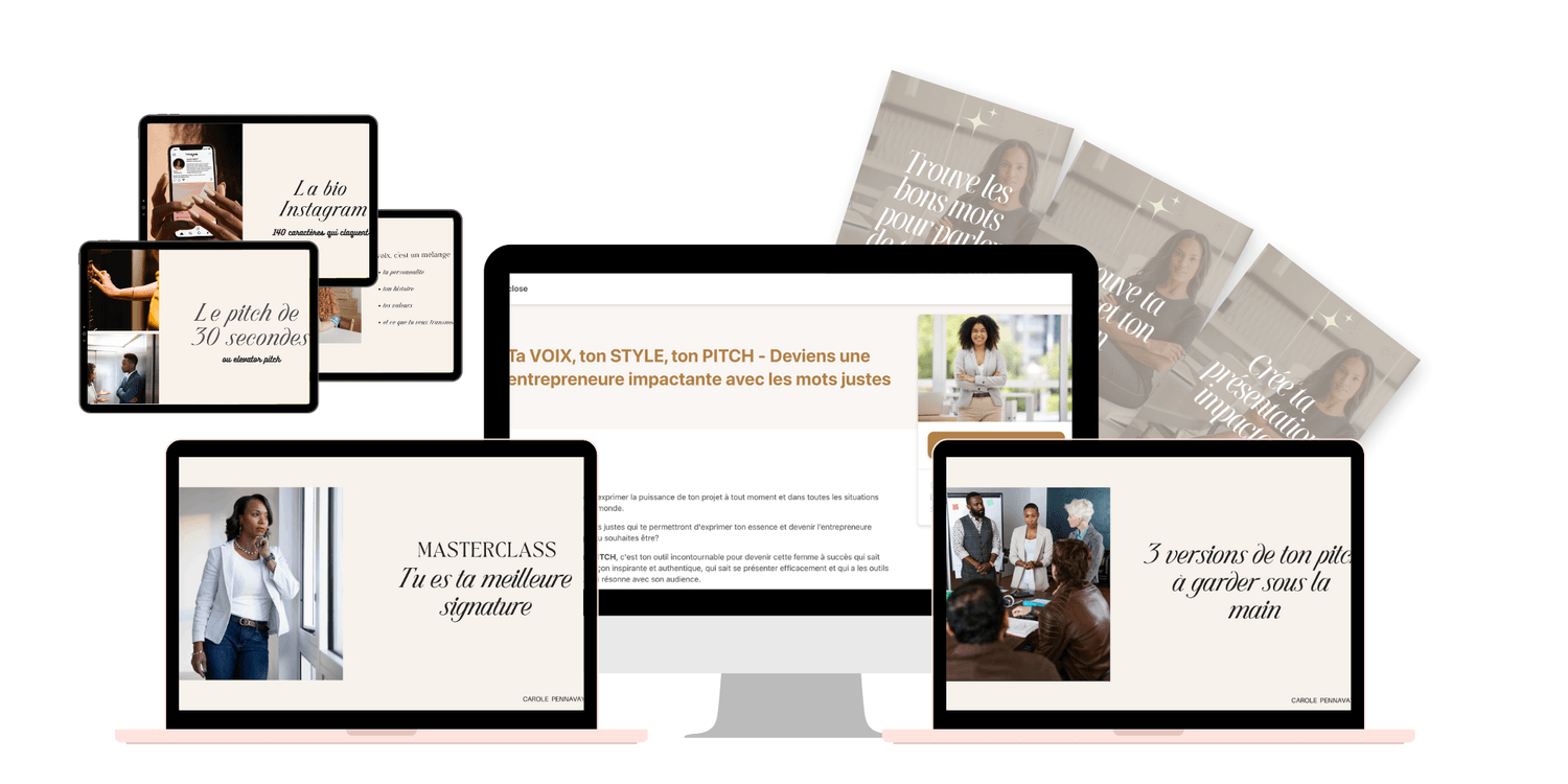 L'outil incontournable pour devenir cette femme à succès qui sait parler de son projet de façon inspirante et authentique, qui sait se présenter efficacement et qui a les outils pour créer du contenu qui résonne avec son audience.